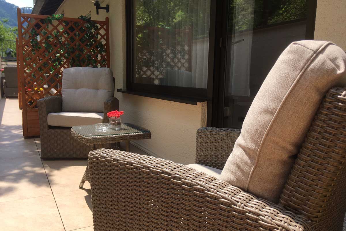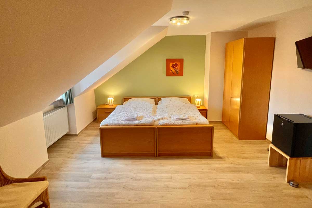 Unser Zimmer Bienengarten ist ausgestattet mit Dusche/WC, Fön, SAT-TV, großes Doppelbett (180 x 200 cm) und Balkon. Von dem Zimmer aus haben Sie einen schönen Ausblick in die Wälder und Weinberge.