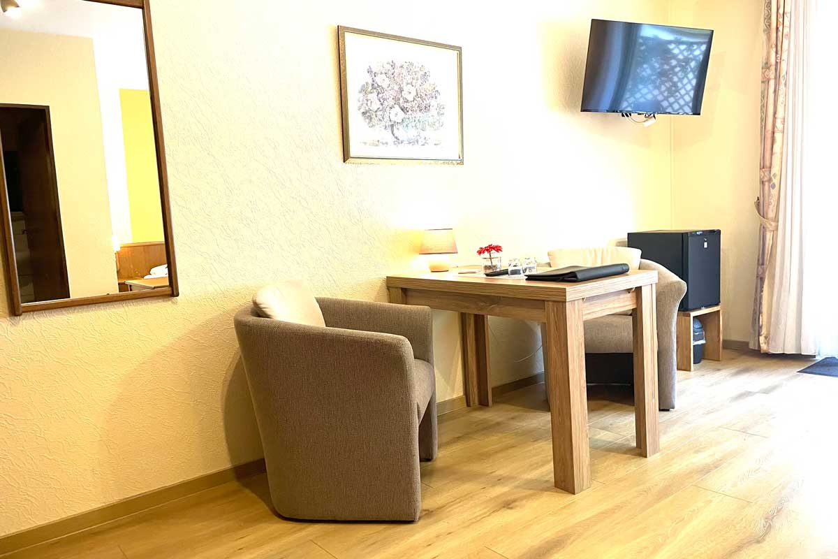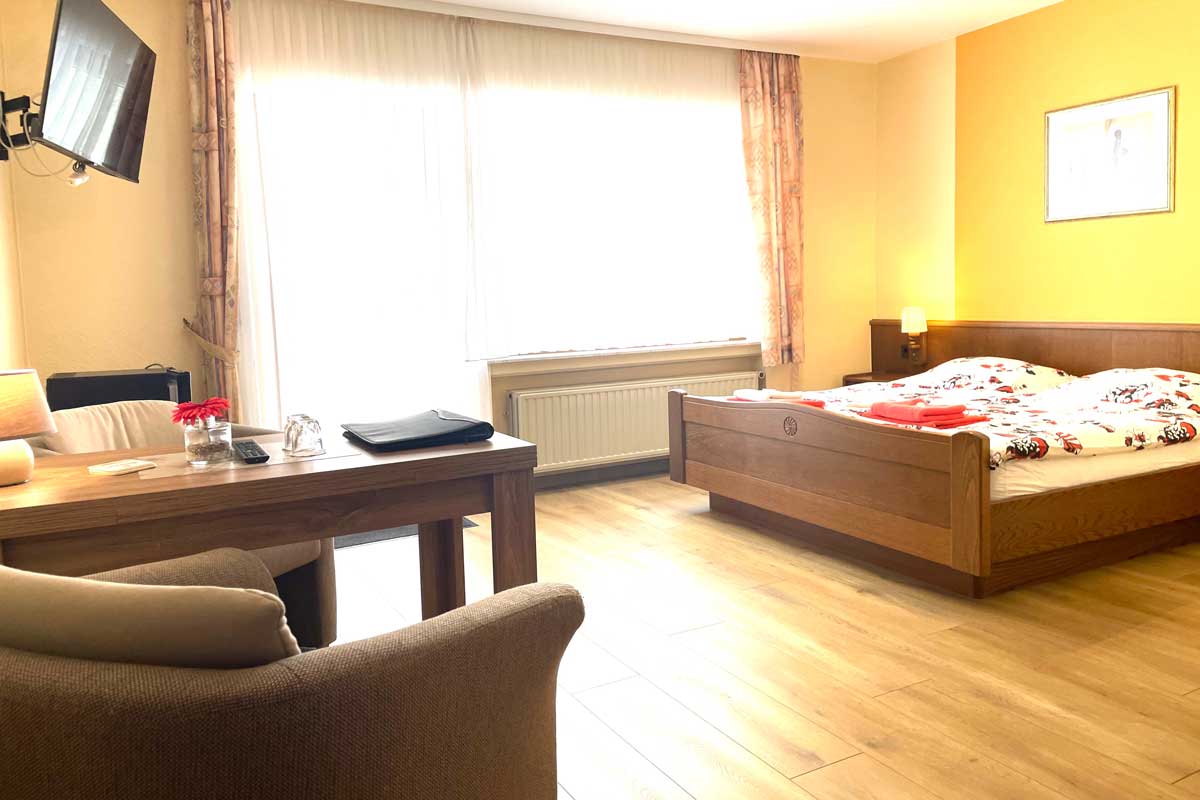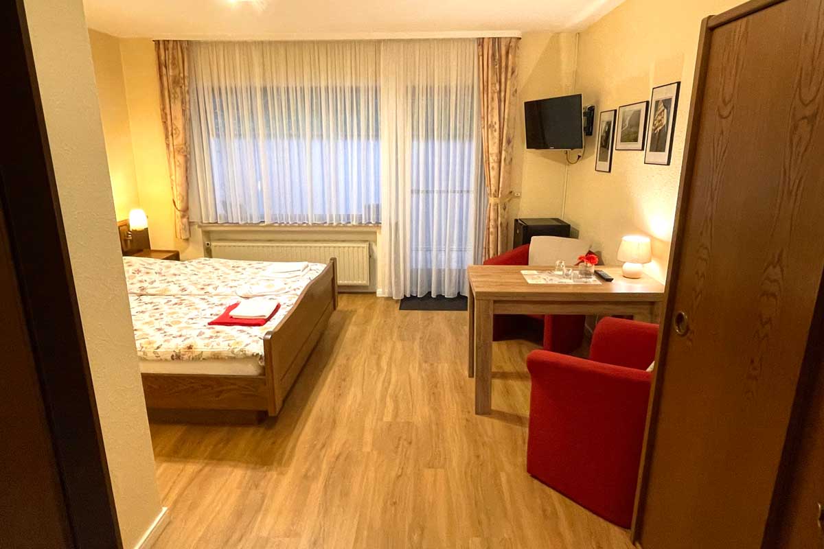 Unser großes Doppelzimmer ist ausgestattet mit Dusche/WC, Fön, SAT-TV, großes Doppelbett (180 x 200 cm) und moderne Klimaanlage mit einfacher Bedienung. Von dem Zimmer aus haben Sie einen schönen Ausblick in die Wälder und Weinberge.